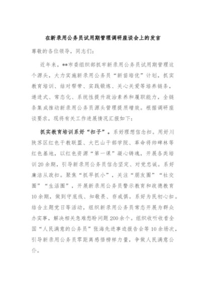 / 【七哥公文】2024年:在新录用公务员试用期管理调研座谈会上的发言+更多免费公文+VX:QiGeGongWen2024