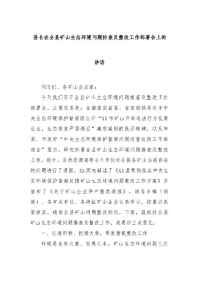 【七哥公文】2024年:县长在全县矿山生态环境问题排查及整改工作部署会上的讲话+更多免费公文+VX:QiGeGongWen2024