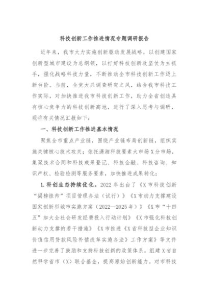 / 【七哥公文】2024年:科技创新工作推进情况专题调研报告+更多免费公文+VX:QiGeGongWen2024