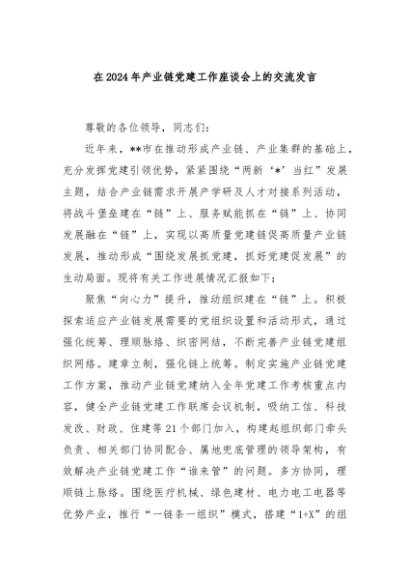 【七哥公文】2024年:在2024年产业链党建工作座谈会上的交流发言 (1)+更多免费公文+VX:QiGeGongWen2024