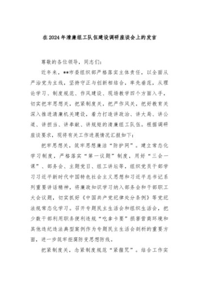 【七哥公文】2024年:在2024年清廉组工队伍建设调研座谈会上的发言 (1)+更多免费公文+VX:QiGeGongWen2024
