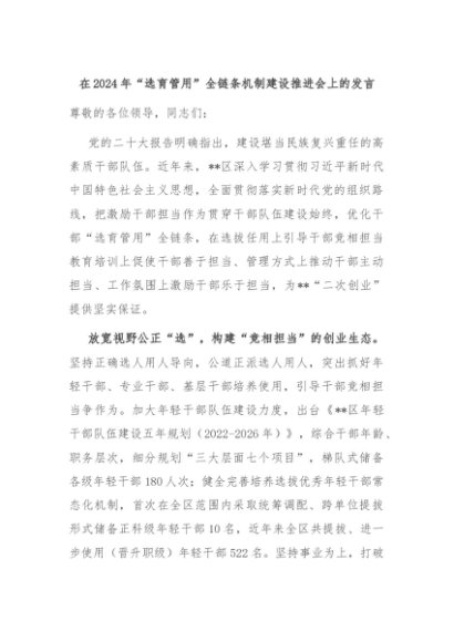 【七哥公文】2024年:在2024年“选育管用”全链条机制建设推进会上的发言+更多免费公文+VX:QiGeGongWen2024