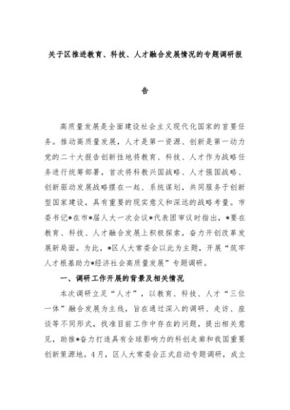 【七哥公文】2024年:关于区推进教育、科技、人才融合发展情况的专题调研报告+更多免费公文+VX:QiGeGongWen2024
