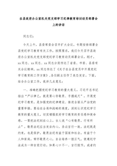 【七哥公文】2024年:在县政府办公室机关党支部学习纪律教育培训动员部署会上的讲话+更多免费公文+VX:QiGeGongWen2024