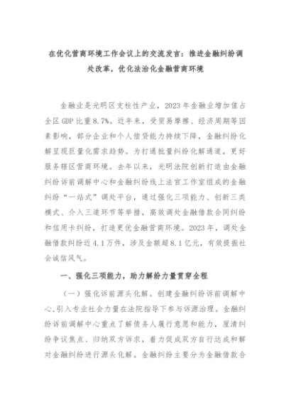 【七哥公文】2024年:在优化营商环境工作会议上的交流发言:推进金融纠纷调处改革,优化法治化金融营商环境+更多免费公文+VX:QiGeGongWen2024