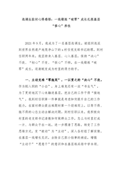 【七哥公文】2024年:选调生驻村心得感悟:一线锻炼“破零”成长扎根基层“修心”养性+更多免费公文+VX:QiGeGongWen2024