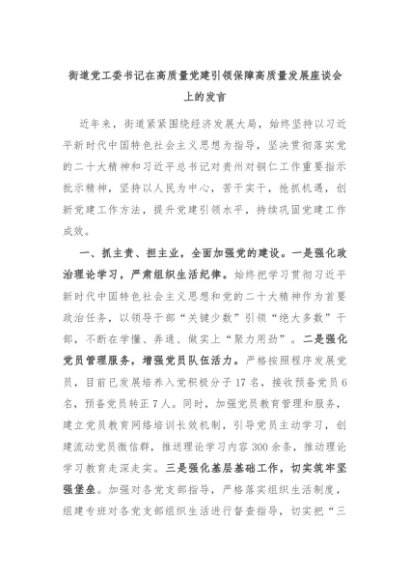 【七哥公文】2024年:街道党工委书记在高质量党建引领保障高质量发展座谈会上的发言+更多免费公文+VX:QiGeGongWen2024