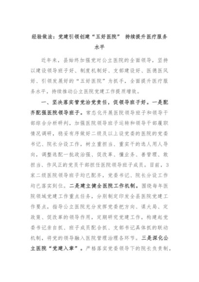 【七哥公文】2024年:经验做法:党建引领创建“五好医院” 持续提升医疗服务水平+更多免费公文+VX:QiGeGongWen2024
