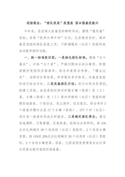 / 【七哥公文】2024年:经验做法:“排队抓尾”筑堡垒 固本强基促振兴+更多免费公文+VX:QiGeGongWen2024