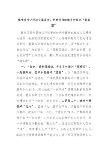 【七哥公文】2024年:镇党委书记经验交流发言:党建引领绘就乡村振兴“新蓝图”+更多免费公文+VX:QiGeGongWen2024