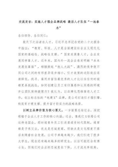 【七哥公文】2024年:交流发言:实施人才强企品牌战略 激活人才队伍“一池春水”+更多免费公文+VX:QiGeGongWen2024