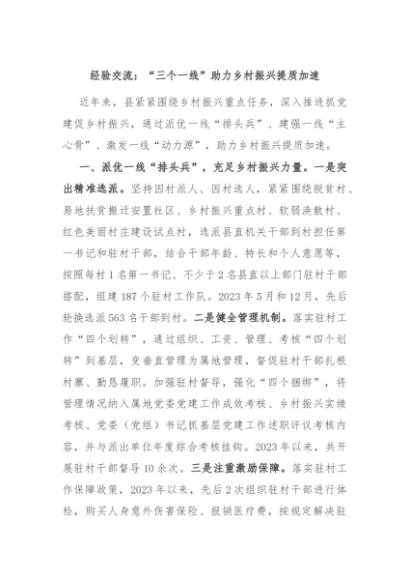【七哥公文】2024年:经验交流:“三个一线”助力乡村振兴提质加速+更多免费公文+VX:QiGeGongWen2024