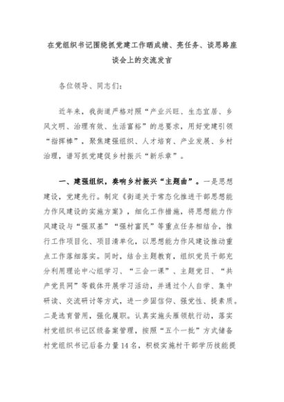 【七哥公文】2024年:在党组织书记围绕抓党建工作晒成绩、亮任务、谈思路座谈会上的交流发言 (1)+更多免费公文+VX:QiGeGongWen2024