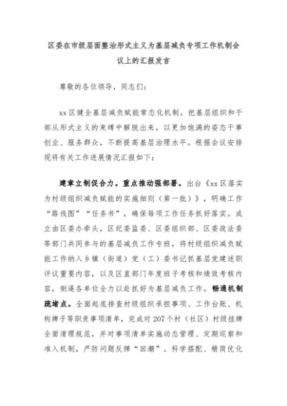 【七哥公文】2024年:区委在市级层面整治形式主义为基层减负专项工作机制会议上的汇报发言 (1)+更多免费公文+VX:QiGeGongWen2024