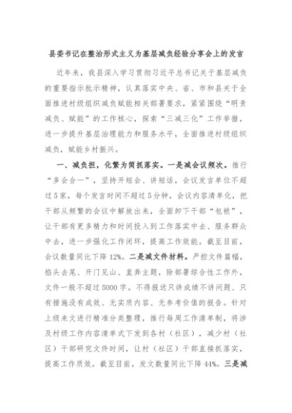 【七哥公文】2024年:县委书记在整治形式主义为基层减负经验分享会上的发言+更多免费公文+VX:QiGeGongWen2024