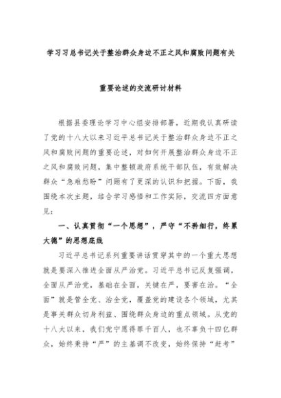 【七哥公文】2024年:学习习总书记关于整治群众身边不正之风和腐败问题有关重要论述的交流研讨材料+更多免费公文+VX:QiGeGongWen2024