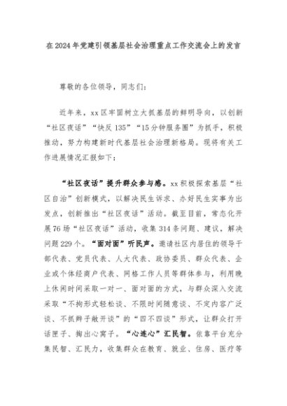 【七哥公文】2024年:在2024年党建引领基层社会治理重点工作交流会上的发言 (1)+更多免费公文+VX:QiGeGongWen2024