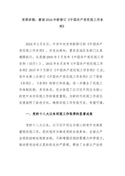 【七哥公文】2024年:党课讲稿:解读2024年新修订《中国共产党巡视工作条例》+更多免费公文+VX:QiGeGongWen2024