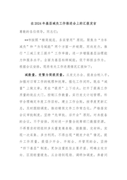 / 【七哥公文】2024年:在2024年基层减负工作推进会上的汇报发言+更多免费公文+VX:QiGeGongWen2024