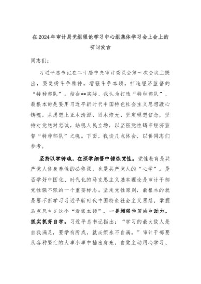 【七哥公文】2024年:在2024年审计局党组理论学习中心组集体学习会上会上的研讨发言+更多免费公文+VX:QiGeGongWen2024