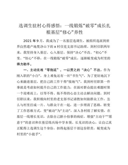 【七哥公文】2024年:选调生驻村心得感悟:一线锻炼“破零”成长扎根基层“修心”养性心得体会+更多免费公文+VX:QiGeGongWen2024