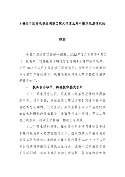 【七哥公文】2024年:X镇关于区委巡察组巡察X镇反馈意见集中整改进展情况的报告+更多免费公文+VX:QiGeGongWen2024