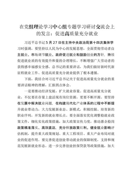 【七哥公文】2024年:在党组理论学习中心组专题学习研讨交流会上的发言:促进高质量充分就业+更多免费公文+VX:QiGeGongWen2024