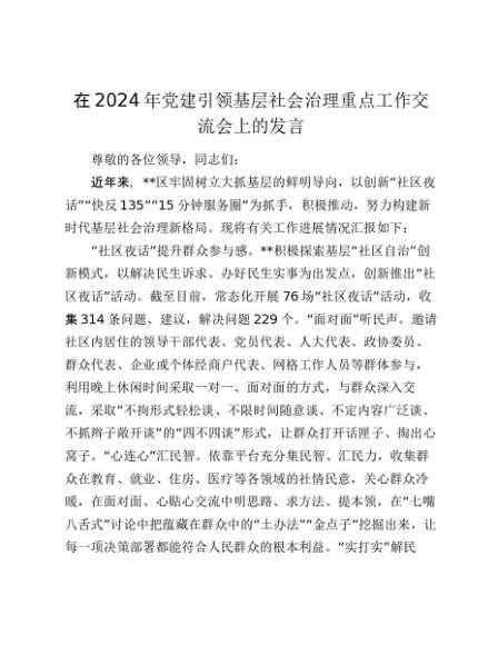 【七哥公文】2024年:在2024年党建引领基层社会治理重点工作交流会上的发言+更多免费公文+VX:QiGeGongWen2024