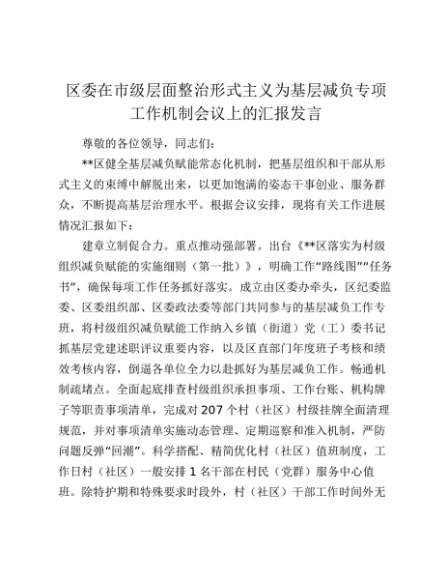 【七哥公文】2024年:区委在市级层面整治形式主义为基层减负专项工作机制会议上的汇报发言+更多免费公文+VX:QiGeGongWen2024