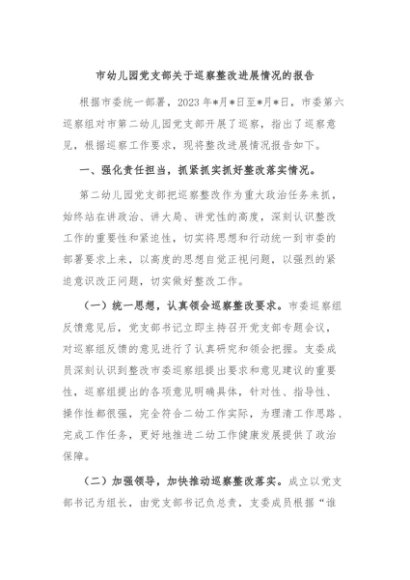 / 【七哥公文】2024年:市幼儿园党支部关于巡察整改进展情况的报告+更多免费公文+VX:QiGeGongWen2024