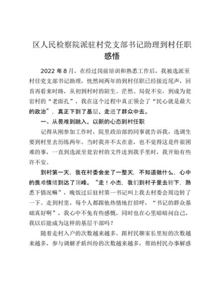 【七哥公文】2024年:区人民检察院派驻村党支部书记助理到村任职感悟心得体会+更多免费公文+VX:QiGeGongWen2024