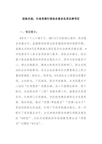 / 【七哥公文】2024年:经验交流:打造党建引领政务服务优质品牌项目+更多免费公文+VX:QiGeGongWen2024