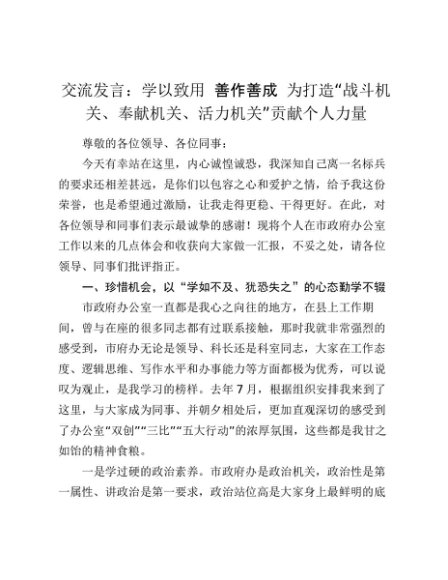 【七哥公文】2024年:交流发言:学以致用善作善成为打造“战斗机关、奉献机关、活力机关”贡献个人力量+更多免费公文+VX:QiGeGongWen2024