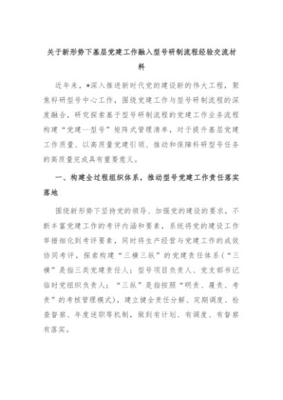 【七哥公文】2024年:关于新形势下基层党建工作融入型号研制流程经验交流材料+更多免费公文+VX:QiGeGongWen2024