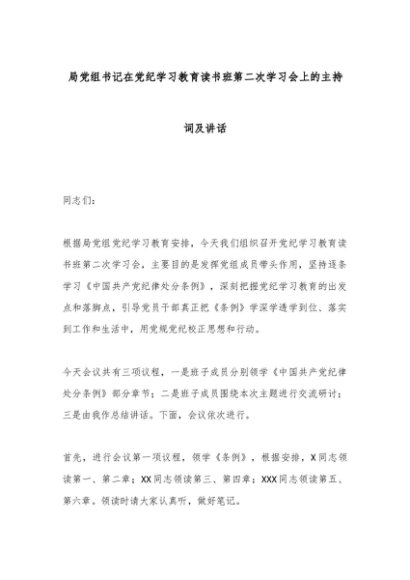 【七哥公文】2024年:局党组书记在党纪学习教育读书班第二次学习会上的主持词及讲话+更多免费公文+VX:QiGeGongWen2024