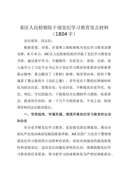 / 【七哥公文】2024年:某区人民检察院干部党纪学习教育发言材料1804字+更多免费公文+VX:QiGeGongWen2024