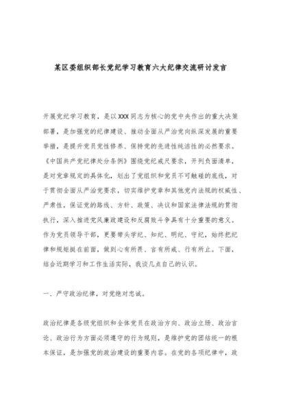 / 【七哥公文】2024年:某区委组织部长党纪学习教育六大纪律交流研讨发言+更多免费公文+VX:QiGeGongWen2024