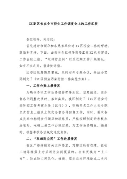 【七哥公文】2024年:XX副区长在全市控尘工作调度会上的工作汇报+更多免费公文+VX:QiGeGongWen2024