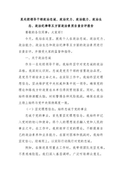 【七哥公文】2024年:某处级领导干部政治忠诚、政治定力、政治能力、政治生态、政治纪律等五方面政治素质自查自评报告+更多免费公文+VX:QiGeGongWen2024