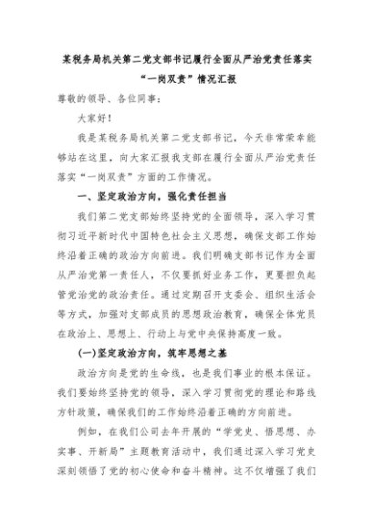 【七哥公文】2024年:某税务局机关第二党支部书记履行全面从严治党责任落实“一岗双责”情况汇报+更多免费公文+VX:QiGeGongWen2024