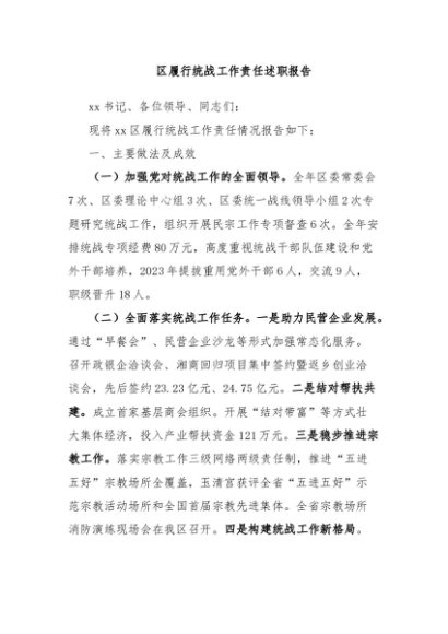 / 【七哥公文】2024年:区履行统战工作责任述职报告+更多免费公文+VX:QiGeGongWen2024