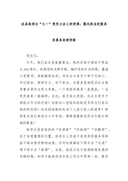 【七哥公文】2024年:在县政府办“七一”党员大会上的党课:强化担当优服务求真务实树形象+更多免费公文+VX:QiGeGongWen2024