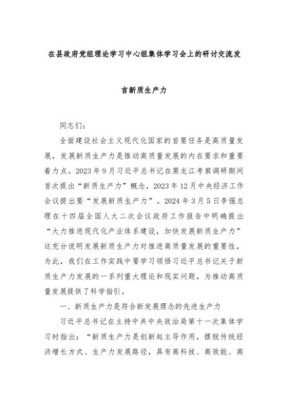 【七哥公文】2024年:在县政府党组理论学习中心组集体学习会上的研讨交流发言新质生产力+更多免费公文+VX:QiGeGongWen2024