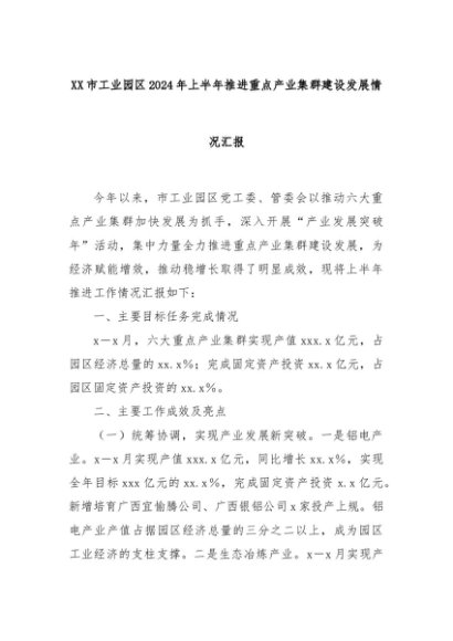 【七哥公文】2024年:XX市工业园区2024年上半年推进重点产业集群建设发展情况汇报+更多免费公文+VX:QiGeGongWen2024