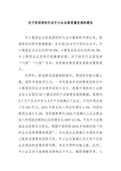 【七哥公文】2024年:关于促进纺织行业中小企业高质量发展的建议+更多免费公文+VX:QiGeGongWen2024