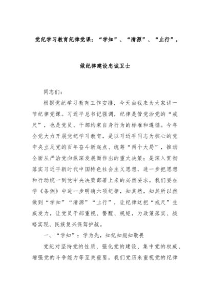 【七哥公文】2024年:党纪学习教育纪律党课:“学知”、“清源”、“止行”,做纪律建设忠诚卫士+更多免费公文+VX:QiGeGongWen2024