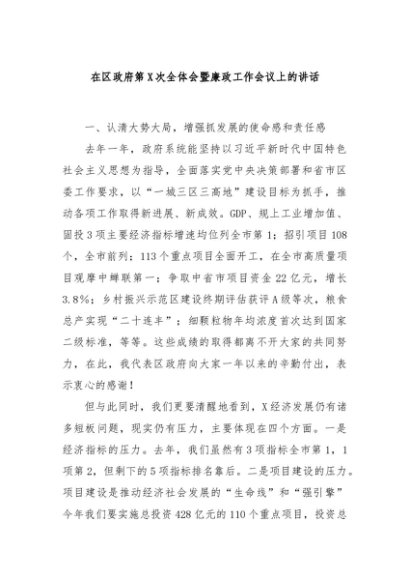 / 【七哥公文】2024年:在区政府第X次全体会暨廉政工作会议上的讲话+更多免费公文+VX:QiGeGongWen2024