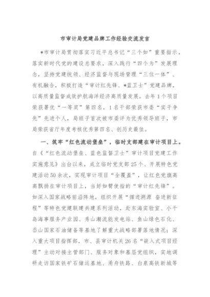/ 【七哥公文】2024年:市审计局党建品牌工作经验交流发言+更多免费公文+VX:QiGeGongWen2024