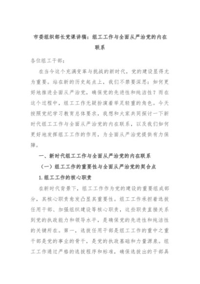 【七哥公文】2024年:市委组织部长党课讲稿:组工工作与全面从严治党的内在联系+更多免费公文+VX:QiGeGongWen2024