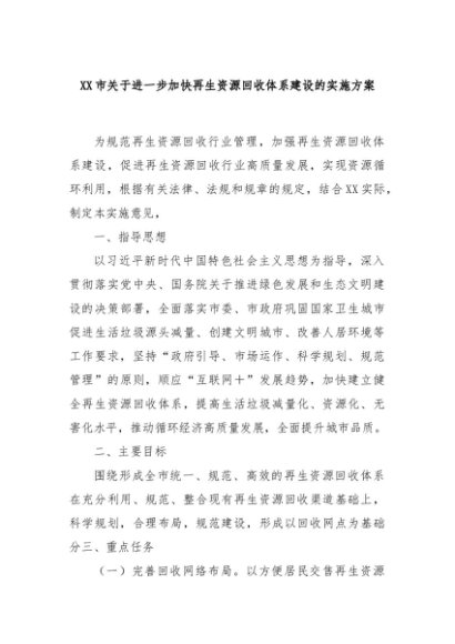 【七哥公文】2024年:XX市关于进一步加快再生资源回收体系建设的实施方案+更多免费公文+VX:QiGeGongWen2024